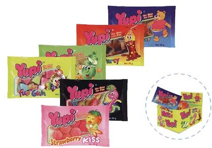These are our regular favorites. They are Apple Rings, Cola Bottle (oil/sugar coated), Fun Gum (mini fried egg), Strawberry Kiss, Glow Worm (oil/sugar coated), Happy Bear's Day (oil/sugar coated). They are available in 10g sachet, 50g bag, 120g window bag, and 500g display box.