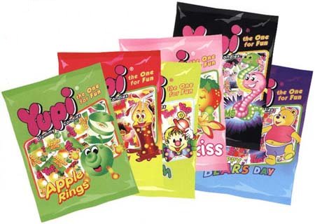 These are our regular favorites. They are Apple Rings, Cola Bottle (oil/sugar coated), Fun Gum (mini fried egg), Strawberry Kiss, Glow Worm (oil/sugar coated), Happy Bear's Day (oil/sugar coated). They are available in 10g sachet , 50g bag , 120g window bag , and 500g display box.